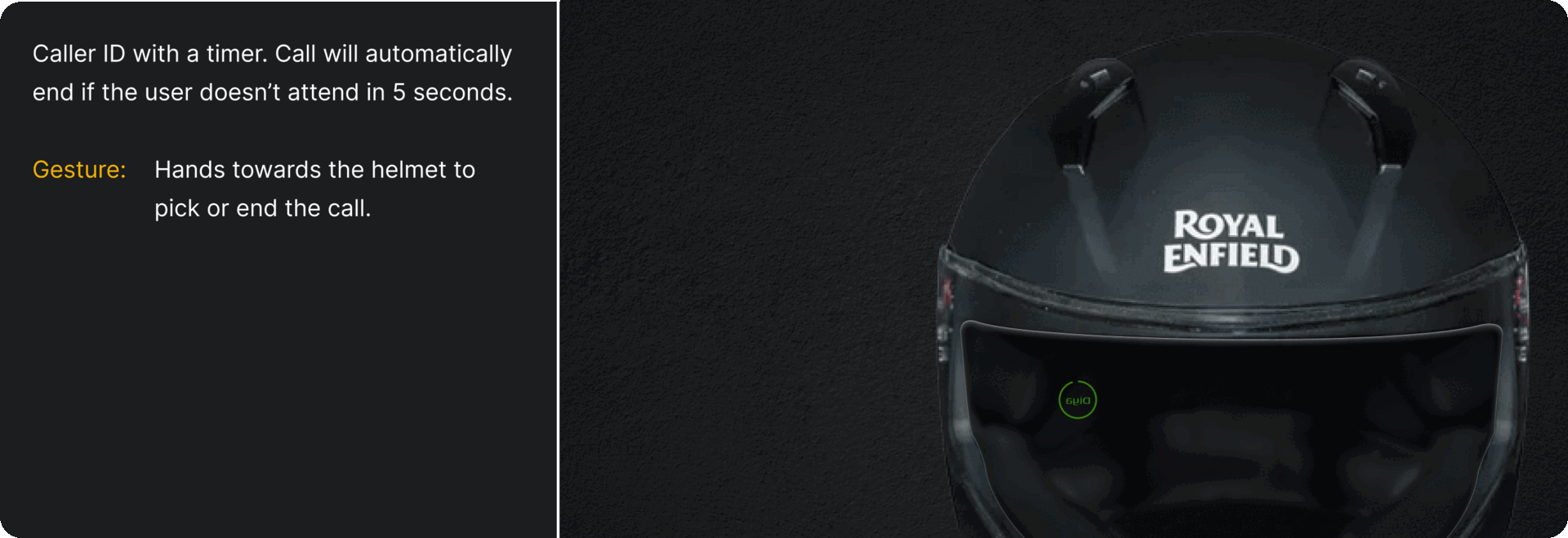 With only voice controlled HUD system in the market, the new Royal Enfield helmet allowing gestural control for the essential riding information such as route directions, caller ID, and music. Reducing risk factors, enhancing experience and ensuring compatibility. For easy access, keep the smartphones in the pocket, eyes on the road and hands near the steering.
