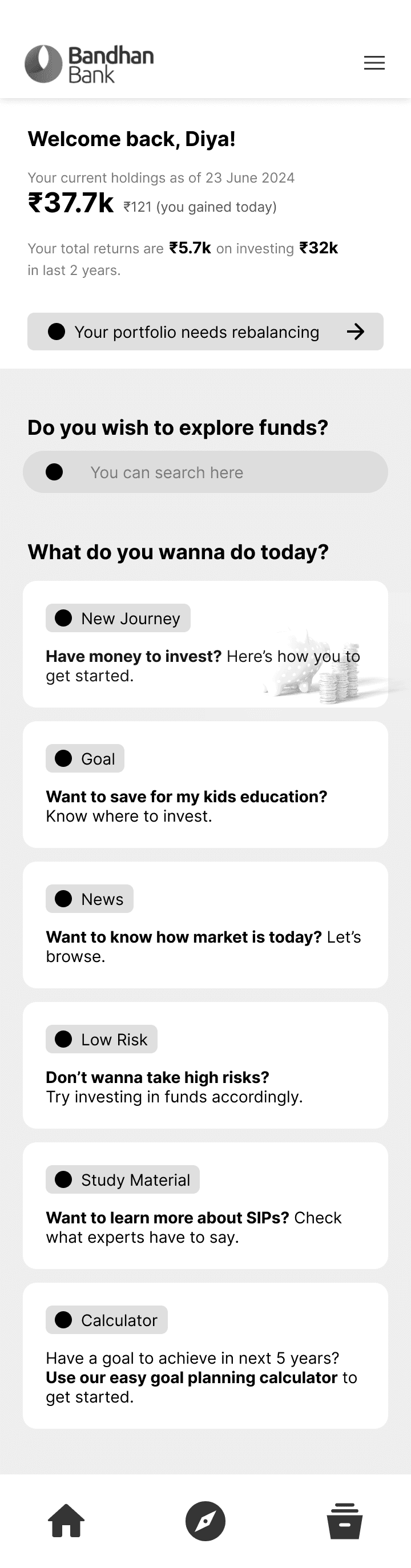 We want to make investment a conversation and not a headache. This approach uses simple conversations to help users make easy decisions for their requirements. Instead of presenting investments as a complex process, we want to dejargonize and simplify the processes and language to make them at ease with the platform. This will help build retention.