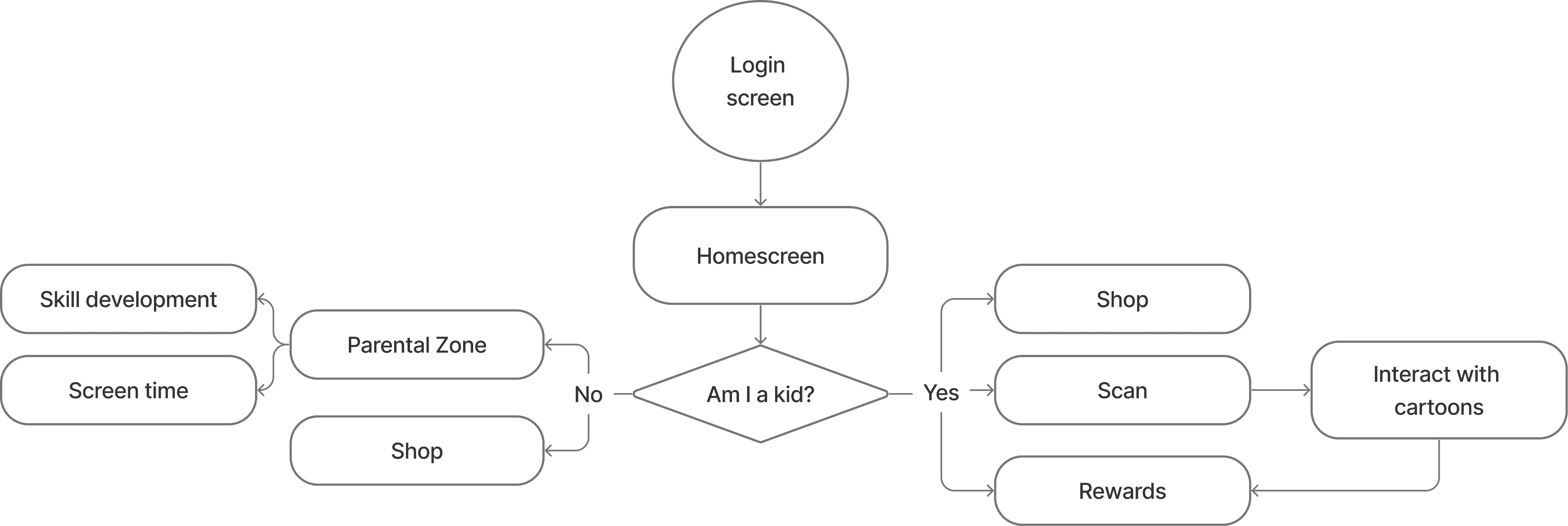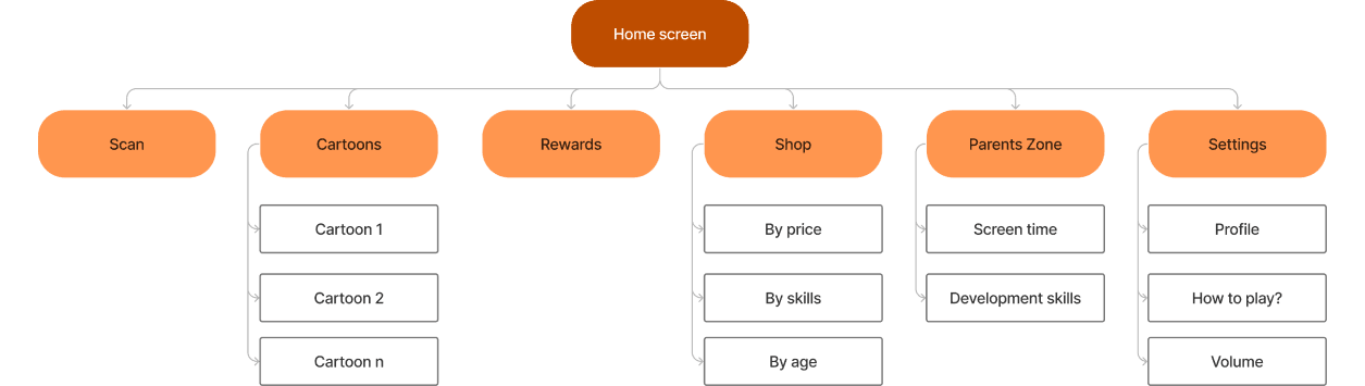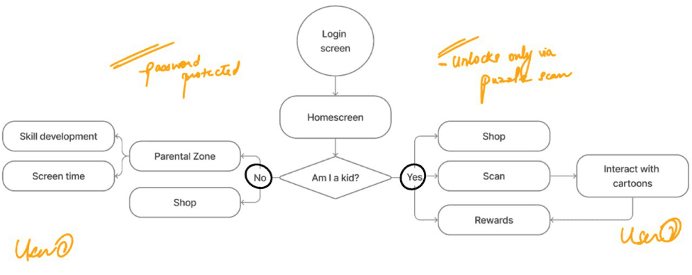 I then mapped out a user flow for both the user personas- kids and their parents with their respective end goals.