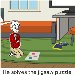 He solves the jigsaw puzzle.